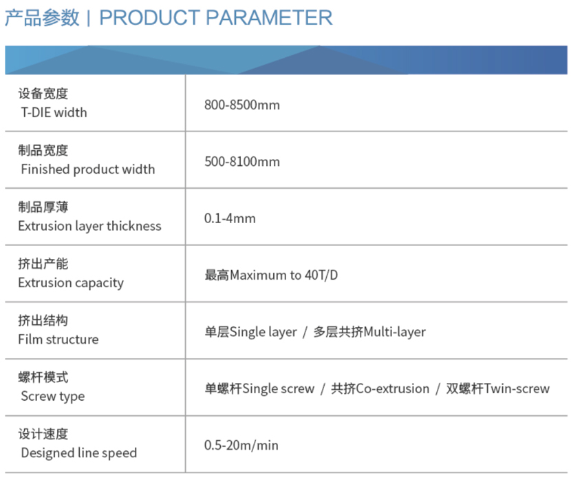 設備按制品結構所需可選擇單層/多層共擠等工藝,還可裝備還可裝備原料自動計量配料系統,多工位自動收卷系統、瑕疵檢測、在線測厚、全自動調節模具、在線分切、卸卷稱重、遠程維保系統等功能件。